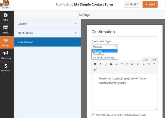 - For form confirmations, you can opt for displaying a thank you message or redirecting users to another page. Click “Settings,” choose “Confirmations” and start to configure your form confirmations.