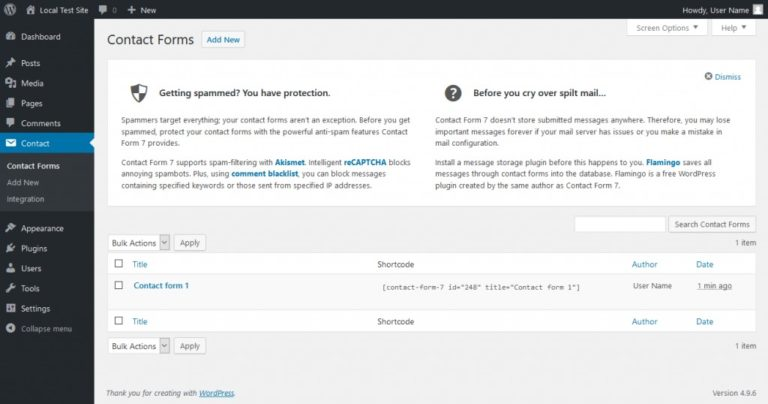 - Open your WordPress dashboard and you’ll see a “Contact” tab in the sidebar. Clicking on it takes you to the screen below.