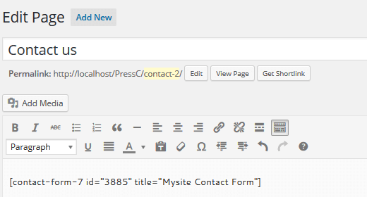 - Open the page you want to add the contact form and paste that shortcode in the text area of your page editor.