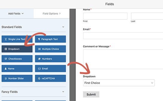 - The WPForms drag and drop form builder will be shown up. Next to it, there’s a pre-built contact form that comes with basic fields, such as “Name,” “Email,” and the “Message” box. You can customize your form per your needs by selecting additional fields on the left sidebar, or dragging and dropping the field order. Once you’re done editing, hit the “Save” button at the top.