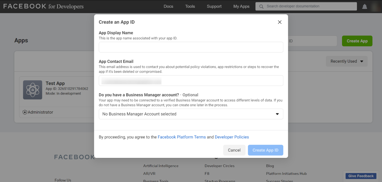 - Next, you need to fill out the Facebook App ID and Facebook App Secret form fields. To do so, go to the Facebook developer portal and create a new app.
