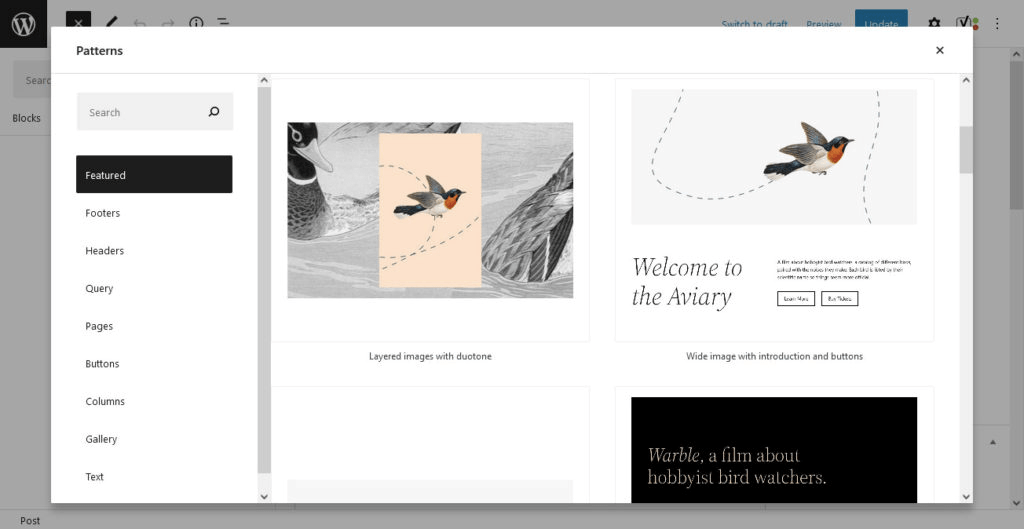 To effectively take advantage of block patterns, you can browse Patterns → Explore after pressing the plus icon. Besides, you’re also able to import patterns from the WordPress pattern directory.